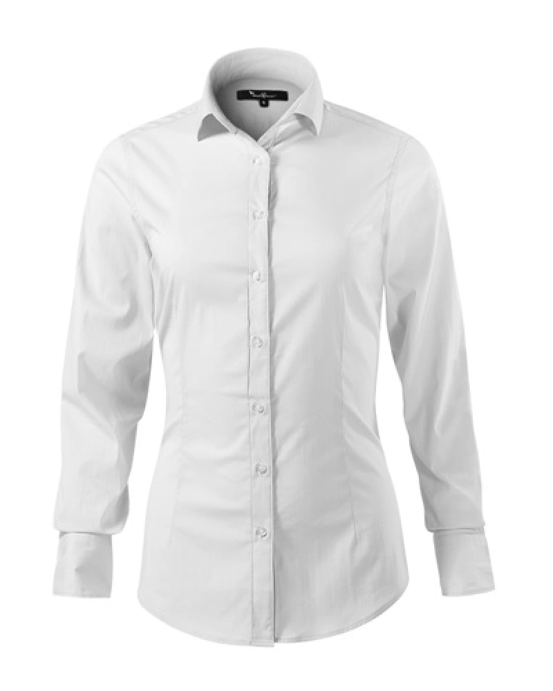 Dámská košile s plátnovou vazbou, projmutý střih s bočními švy, dvojité sedlo na zadním dílu, pasové a prsní záševky, dvoudílný košilový límec, přední kraje začištěny légou, dlouhé rukávy s šikmou manžetou na 2 knoflíčky, perleťové knoflíčky v barvě materiálu (1 náhradní navíc), tvarovaný dolní kraj.Více informací