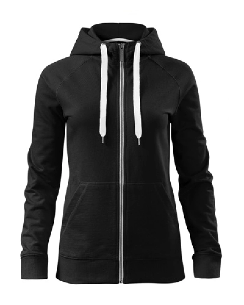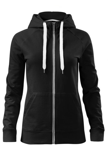 Celopropínací dámská mikina s kontrastními prvky, táhlo zipu s gravírovaným logem. Kapuce s podšívkou, na stažení kontrastní šňůrkou, raglánové rukávy s ozdobným prošitím, dolní lem a manžety rukávů z žebrového úpletu 2:2 s přídavkem 5 % elastanu, vnitřní průkrčník začištěn páskou, nakládané kapsy ve stylu klokanky.