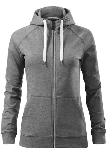 Celopropínací dámská mikina s kontrastními prvky, táhlo zipu s gravírovaným logem. Kapuce s podšívkou, na stažení kontrastní šňůrkou, raglánové rukávy s ozdobným prošitím, dolní lem a manžety rukávů z žebrového úpletu 2:2 s přídavkem 5 % elastanu, vnitřní průkrčník začištěn páskou, nakládané kapsy ve stylu klokanky.