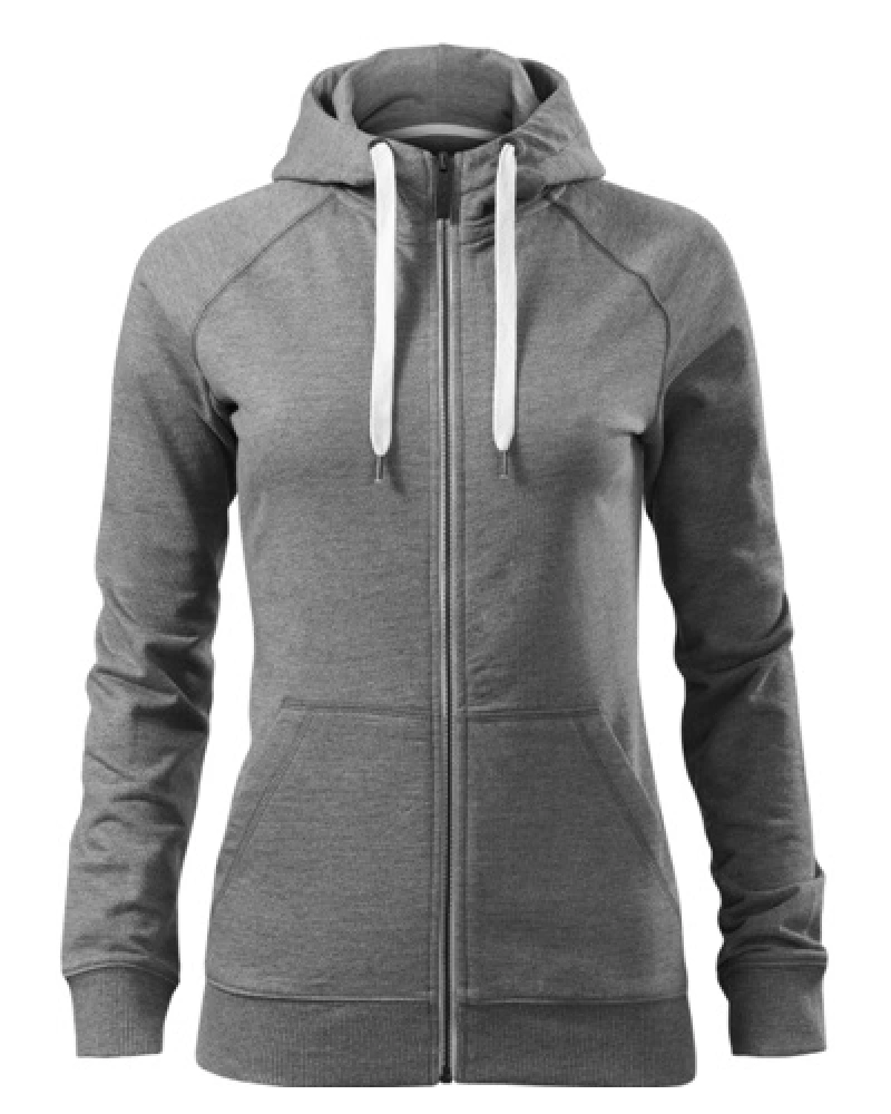 Celopropínací dámská mikina s kontrastními prvky, táhlo zipu s gravírovaným logem. Kapuce s podšívkou, na stažení kontrastní šňůrkou, raglánové rukávy s ozdobným prošitím, dolní lem a manžety rukávů z žebrového úpletu 2:2 s přídavkem 5 % elastanu, vnitřní průkrčník začištěn páskou, nakládané kapsy ve stylu klokanky.Více informací
