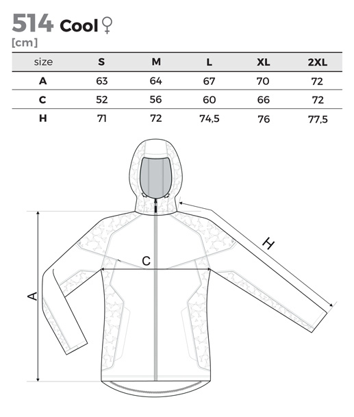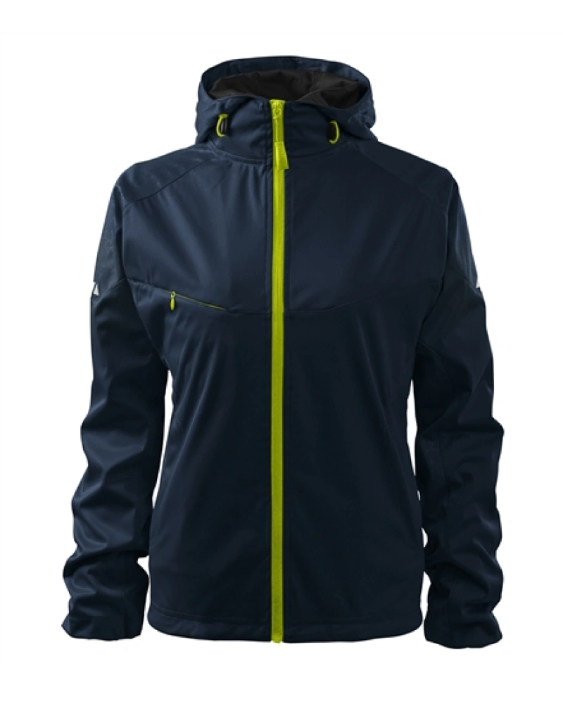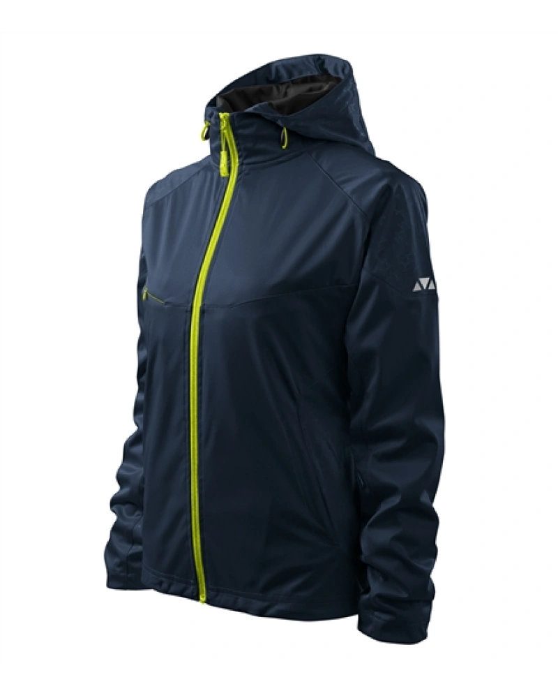 Lehká dámská softshellová bunda s kapucí. Lehce vypasovaný střih, celopropínací reverzní spirálový zip, kapuce a dolní lem na stažení elastickou šňůrkou, lemy rukávů nastavitelné suchým zipem, lištové kapsy s reverzním spirálovým zipem, náprsní kapsa se skrytým zipem v členícím švu, tvarovaný a mírně prodloužený zadní díl, kontrastní a reflexní prvky.