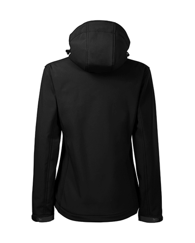 Dámská softshellová bunda lehce vypasovaného střihu s odnímatelnou kapucí. Celopropínací reverzní spirálový zip s krytkou brady, lemy rukávů nastavitelné suchým zipem, dolní lem na stažení elastickou šňůrkou, kapsy s reverzním spirálovým zipem, náprsní kapsa, vnitřní náprsní kapsa na zip se vstupem pro branding, tvarovaný a mírně prodloužený zadní díl.