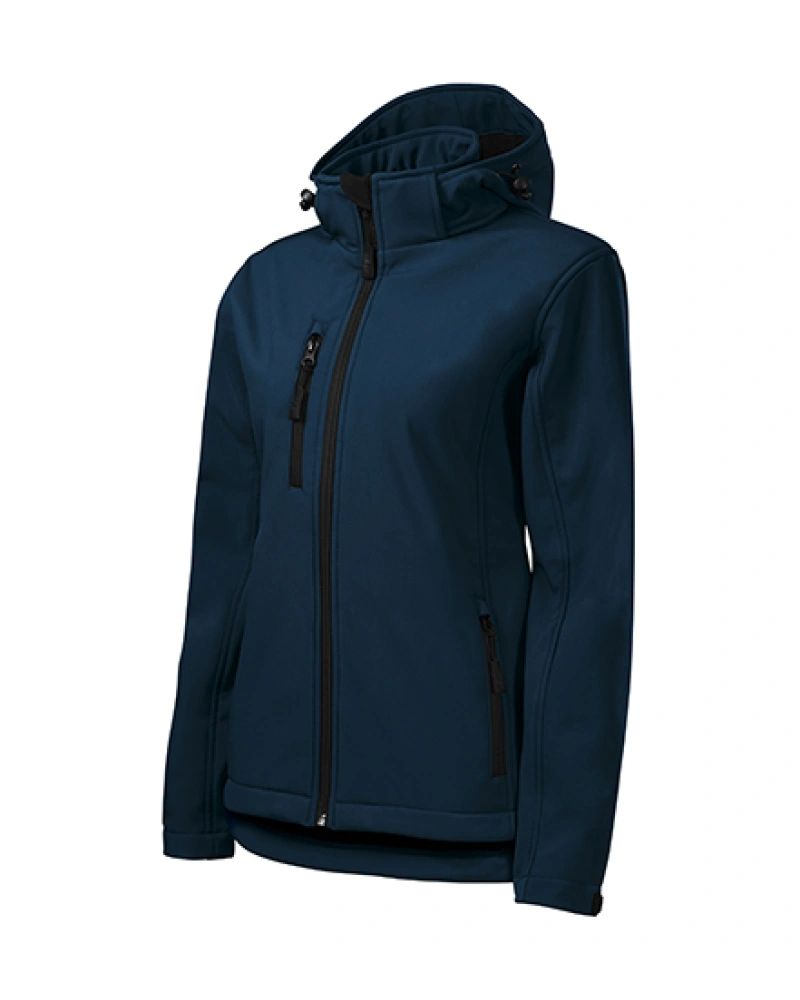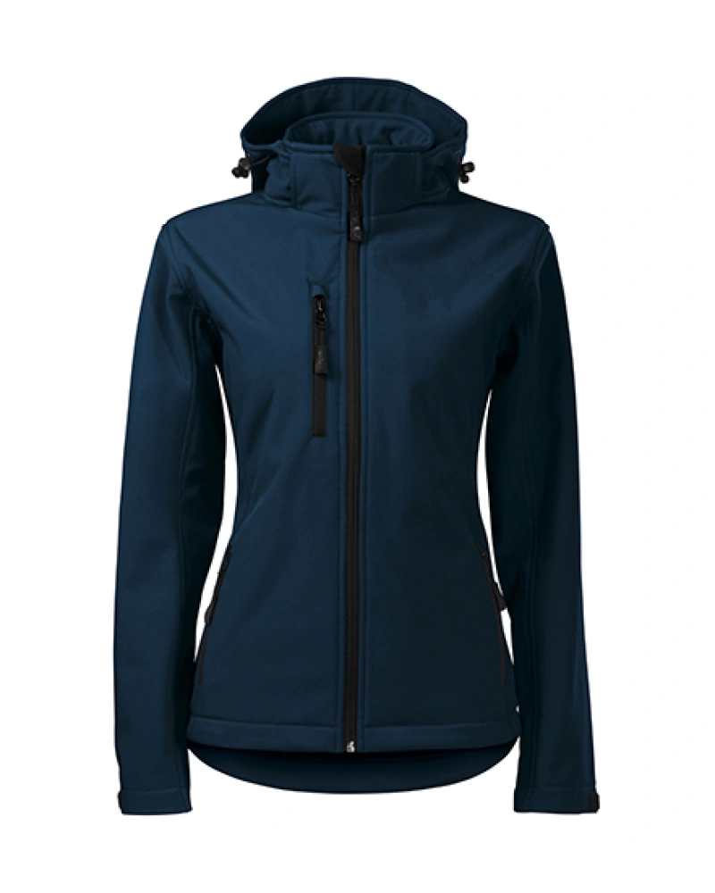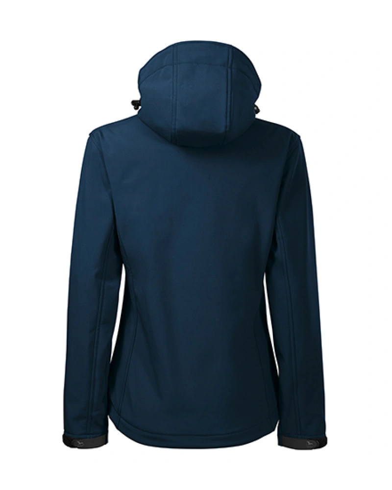 Dámská softshellová bunda lehce vypasovaného střihu s odnímatelnou kapucí. Celopropínací reverzní spirálový zip s krytkou brady, lemy rukávů nastavitelné suchým zipem, dolní lem na stažení elastickou šňůrkou, kapsy s reverzním spirálovým zipem, náprsní kapsa, vnitřní náprsní kapsa na zip se vstupem pro branding, tvarovaný a mírně prodloužený zadní díl.
