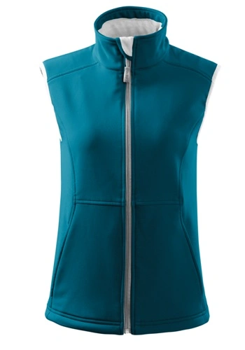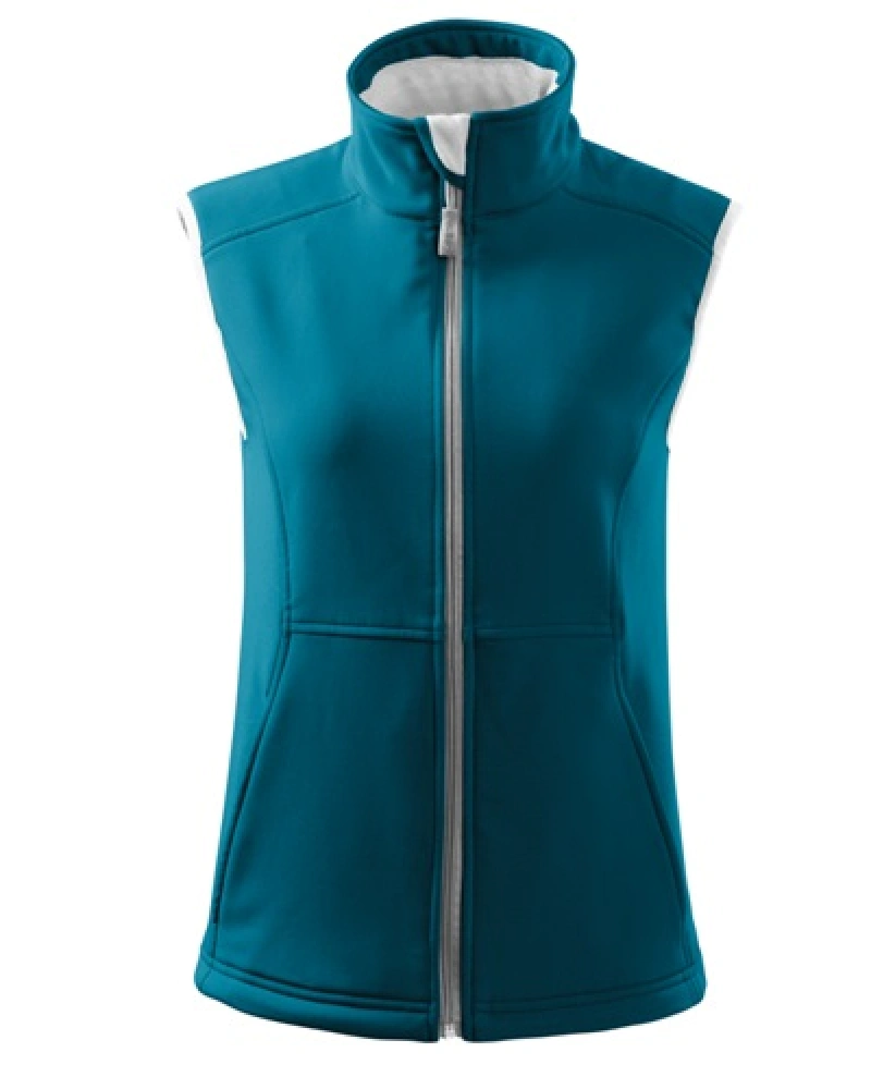 Dámská softshellová vesta s lehce vypasovaným střihem zvýrazňujícím dámskou siluetu, celopropínací spirálový zip s krytkou brady, dolní lem na stažení elastickou šňůrkou, kapsy na zip skryté v členících švech, kontrastní prvky, vnitřní fleece s antipilingovou úpravou.