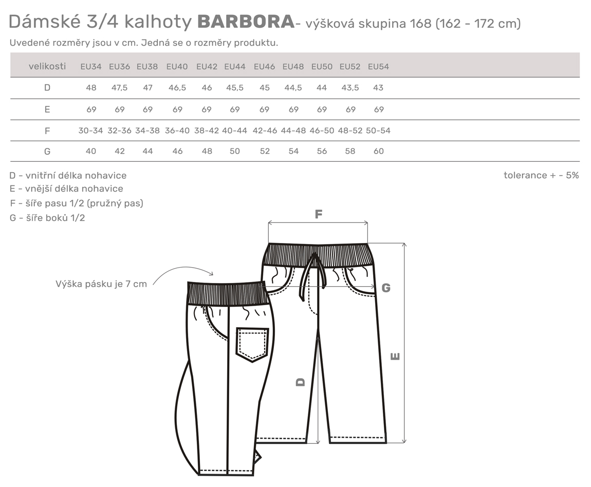 Dámské 3/4 kalhoty, zadní pásek se regulujícími zápinkami, boční zapínání, mandlovací knoflíky, šikmé boční kapsy, v zadním díle záševky, konfekční velikosti.
