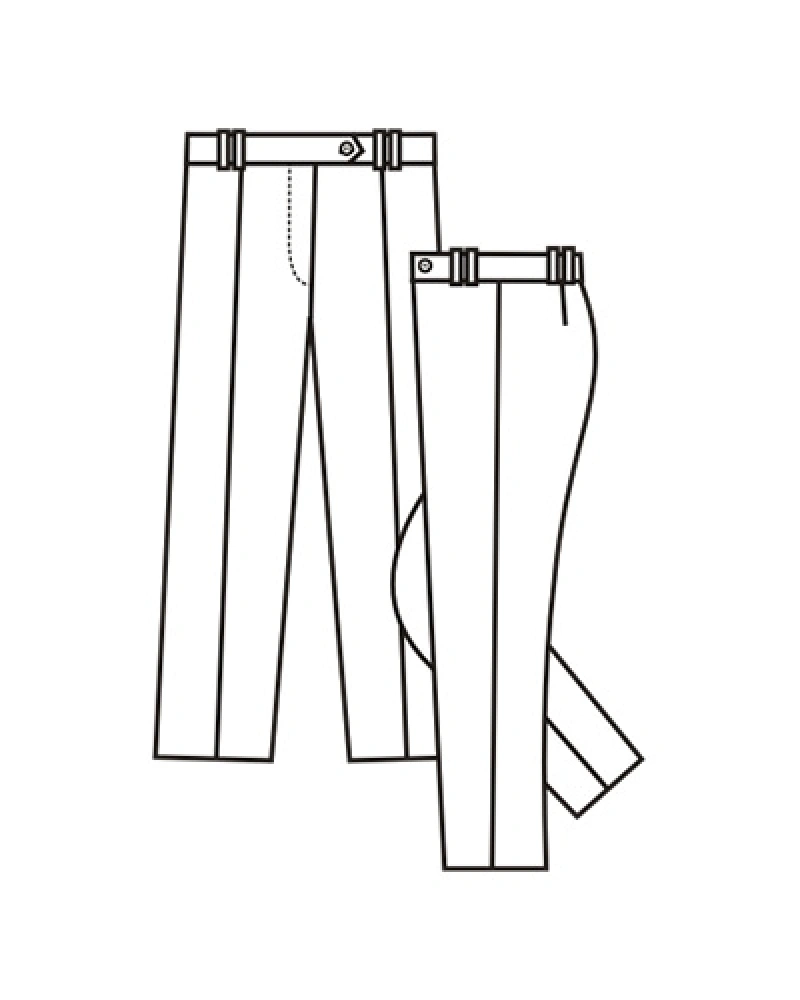 Dámské kalhoty jsou do pásku, poutka v pase jsou našitá vždy dvě vedle sebe, rozparek je na uzávěr, v pásku je knoflík, v zadním díle jsou odšité záševky, na předních dílech jsou zažehlené puky.Více informací