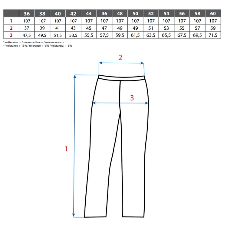 Dámské montérkové kalhoty, pas s poutky na opasek, pas na bocích do gumy (od velikosti 50), přední vakové kapsy, boční multifunkční kapsa, zadní dvojité kapsy, reflexní doplňky.
