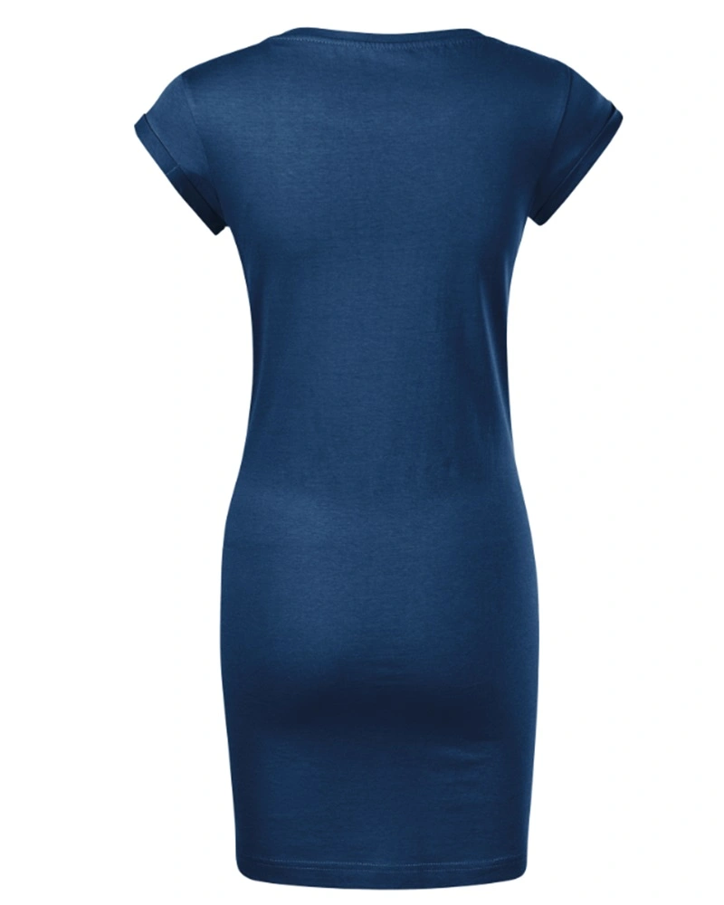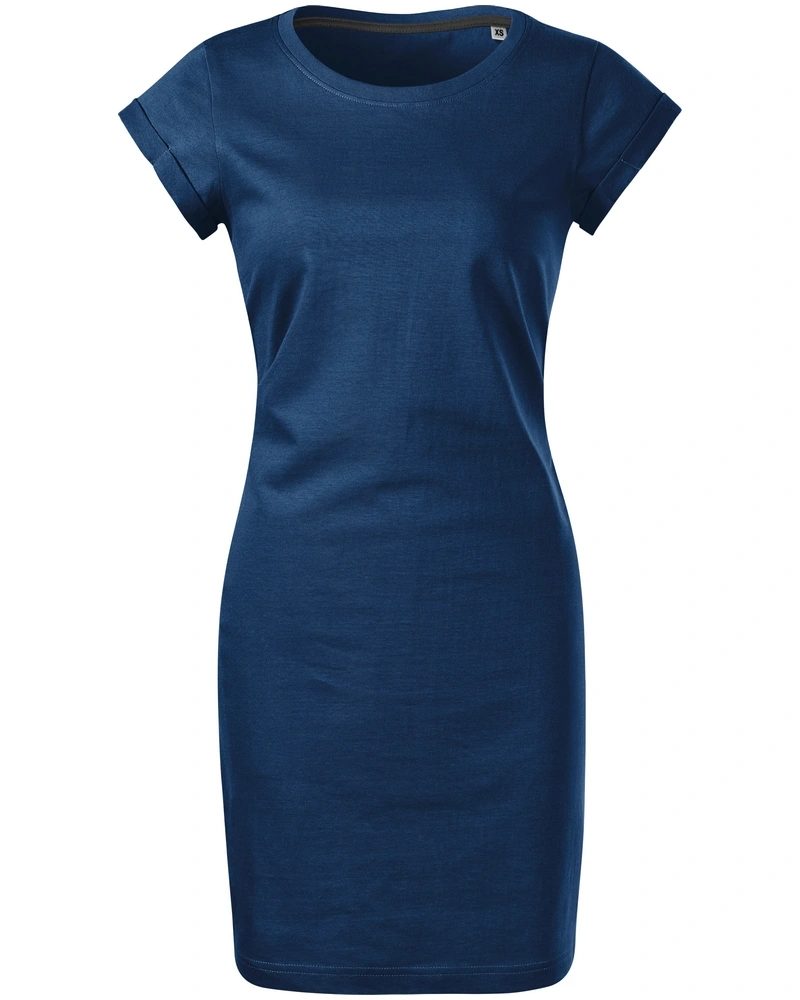 Dámské šaty FREEDOM volného, lehce tvarovaného střihu s bočními švy, úzký lem průkrčníku z vrchového materiálu s 5 % elastanu, zpevňující páska od ramene k rameni, ohrnuté rukávy zachycené ve 4 bodech šitím.