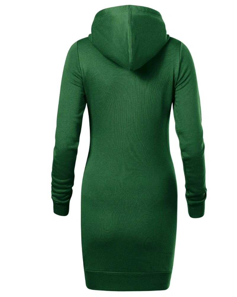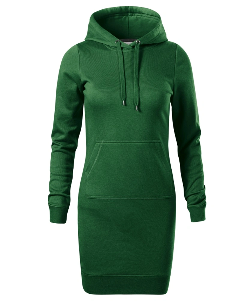 Dámské šaty lehce vypasovaného střihu s bočními švy, délka nad kolena, kapuce s podšívkou, na stažení šňůrkou. Vnitřní část průkrčníku začištěna páskou v barvě ebony gray, dolní lem a manžety rukávů z žebrového úpletu 1:1 s 5 % elastanu, nakládaná kapsa ve stylu klokanky.Více informací