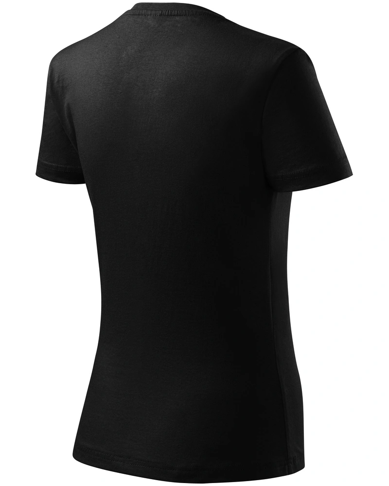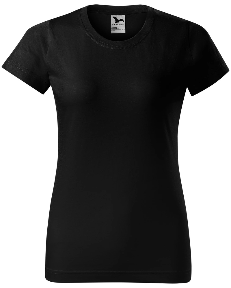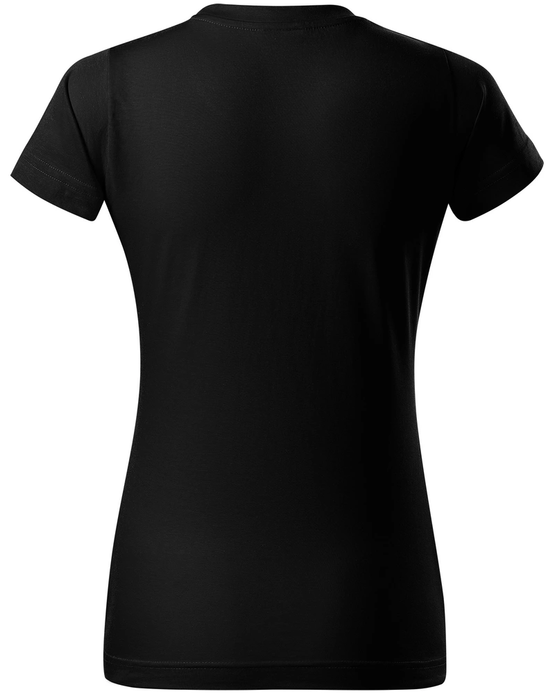 Klasické dámské tričko s lehce vypasovaného střihu. Úzký lem průkrčníku z žebrového úpletu 1:1 s 5 % elastanu, vnitřní část průkrčníku začištěna páskou z vrchového materiálu, zpevnění ramenních švů páskou.