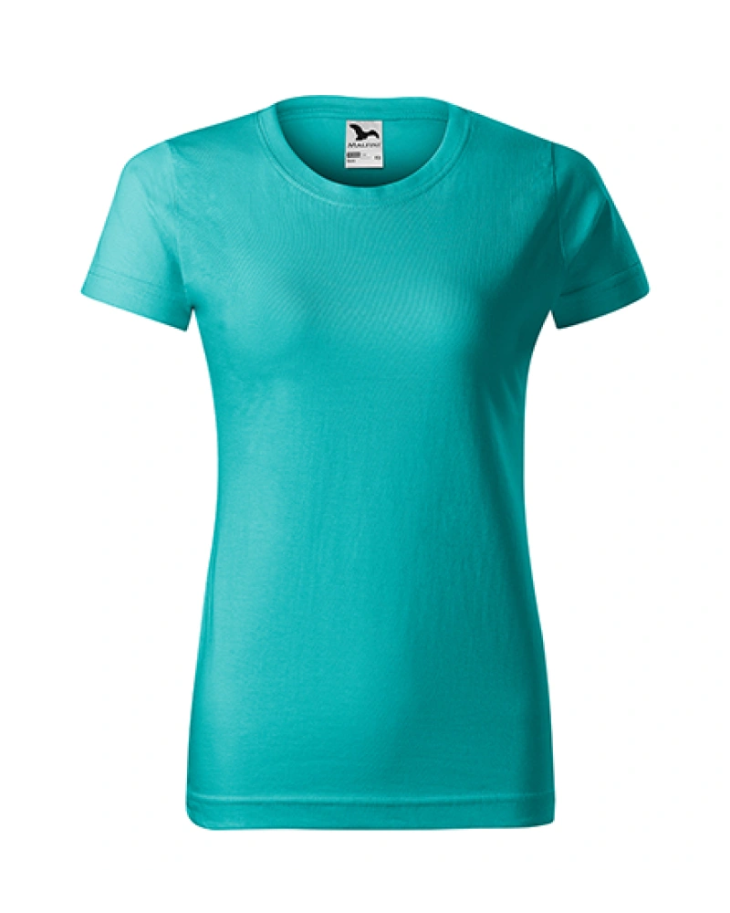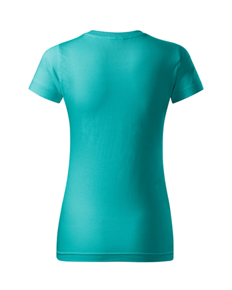 Klasické dámské tričko s lehce vypasovaného střihu. Úzký lem průkrčníku z žebrového úpletu 1:1 s 5 % elastanu, vnitřní část průkrčníku začištěna páskou z vrchového materiálu, zpevnění ramenních švů páskou.