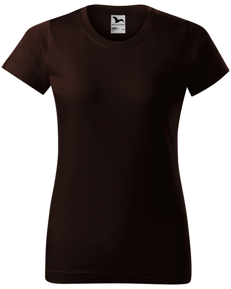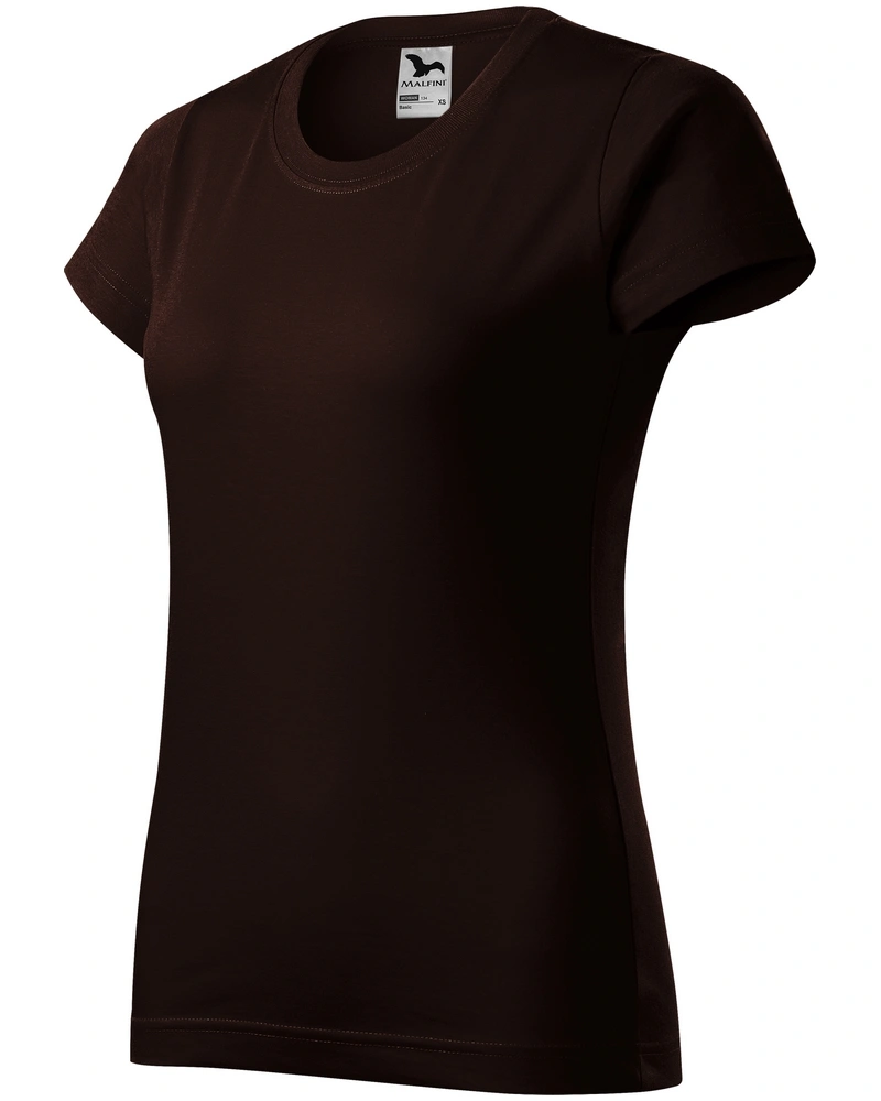 Klasické dámské tričko s lehce vypasovaného střihu. Úzký lem průkrčníku z žebrového úpletu 1:1 s 5 % elastanu, vnitřní část průkrčníku začištěna páskou z vrchového materiálu, zpevnění ramenních švů páskou.