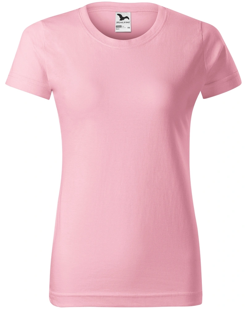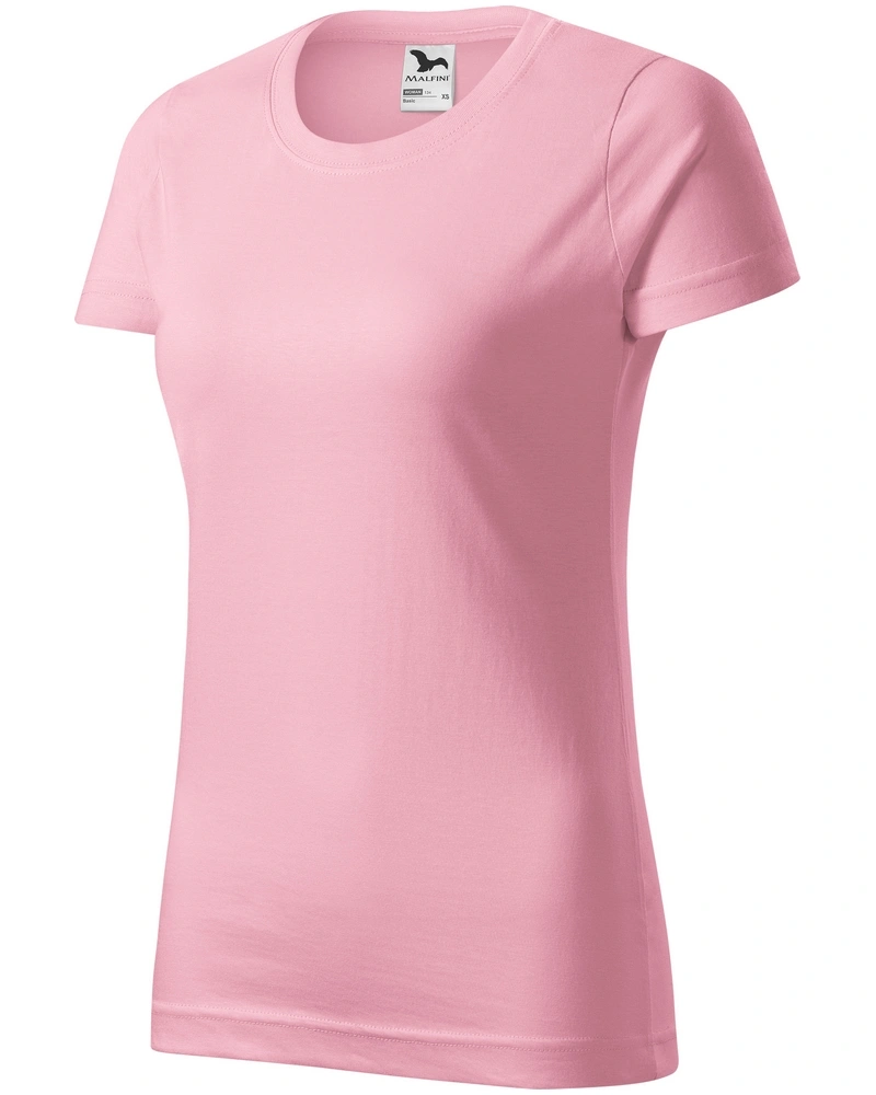 Klasické dámské tričko s lehce vypasovaného střihu. Úzký lem průkrčníku z žebrového úpletu 1:1 s 5 % elastanu, vnitřní část průkrčníku začištěna páskou z vrchového materiálu, zpevnění ramenních švů páskou.