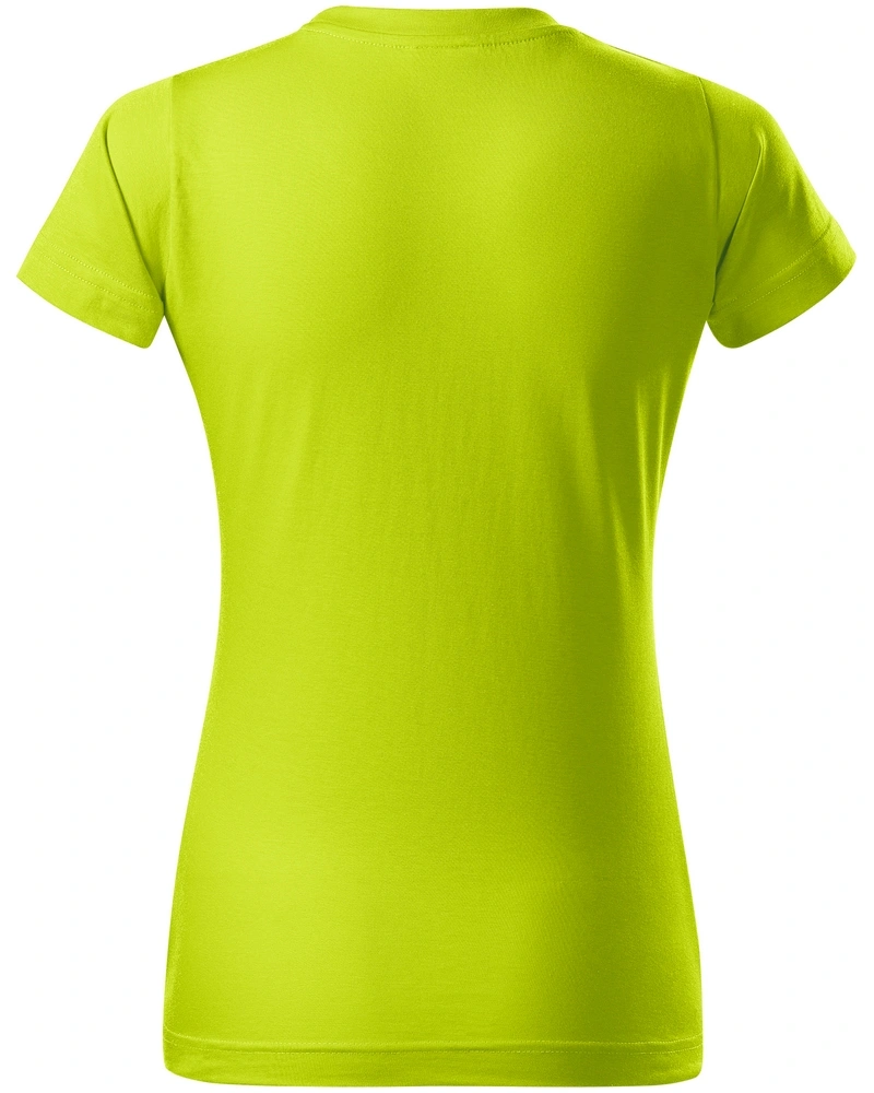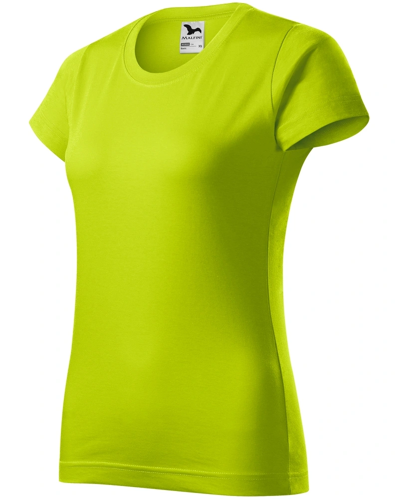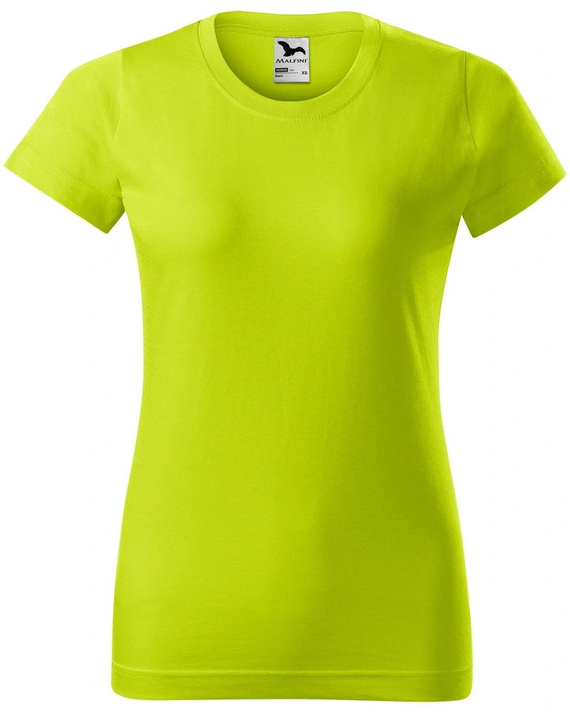 Klasické dámské tričko s lehce vypasovaného střihu. Úzký lem průkrčníku z žebrového úpletu 1:1 s 5 % elastanu, vnitřní část průkrčníku začištěna páskou z vrchového materiálu, zpevnění ramenních švů páskou.