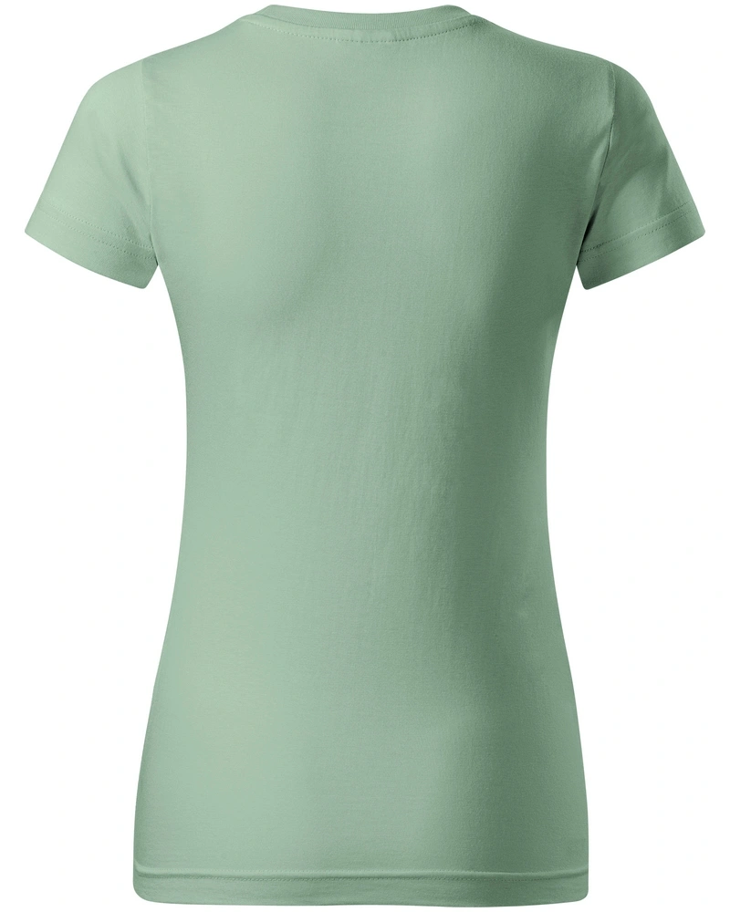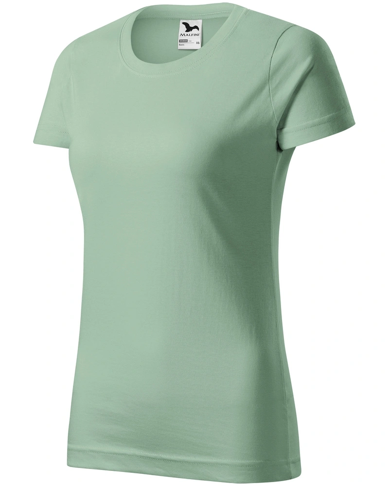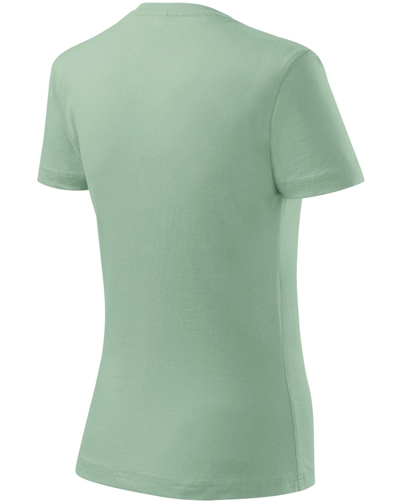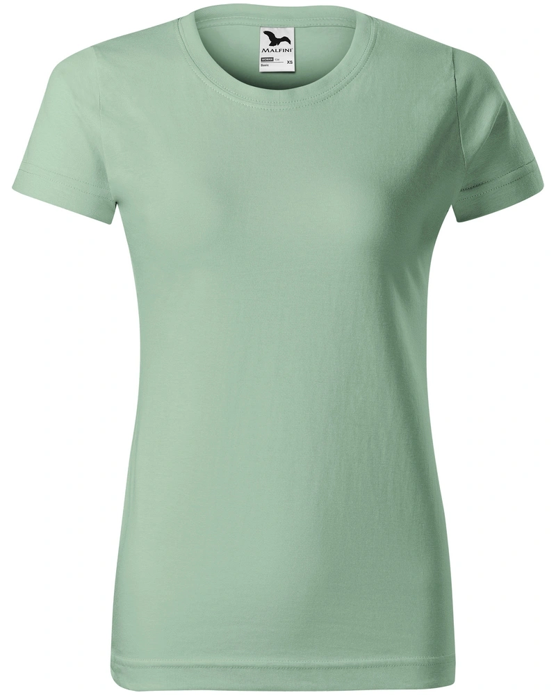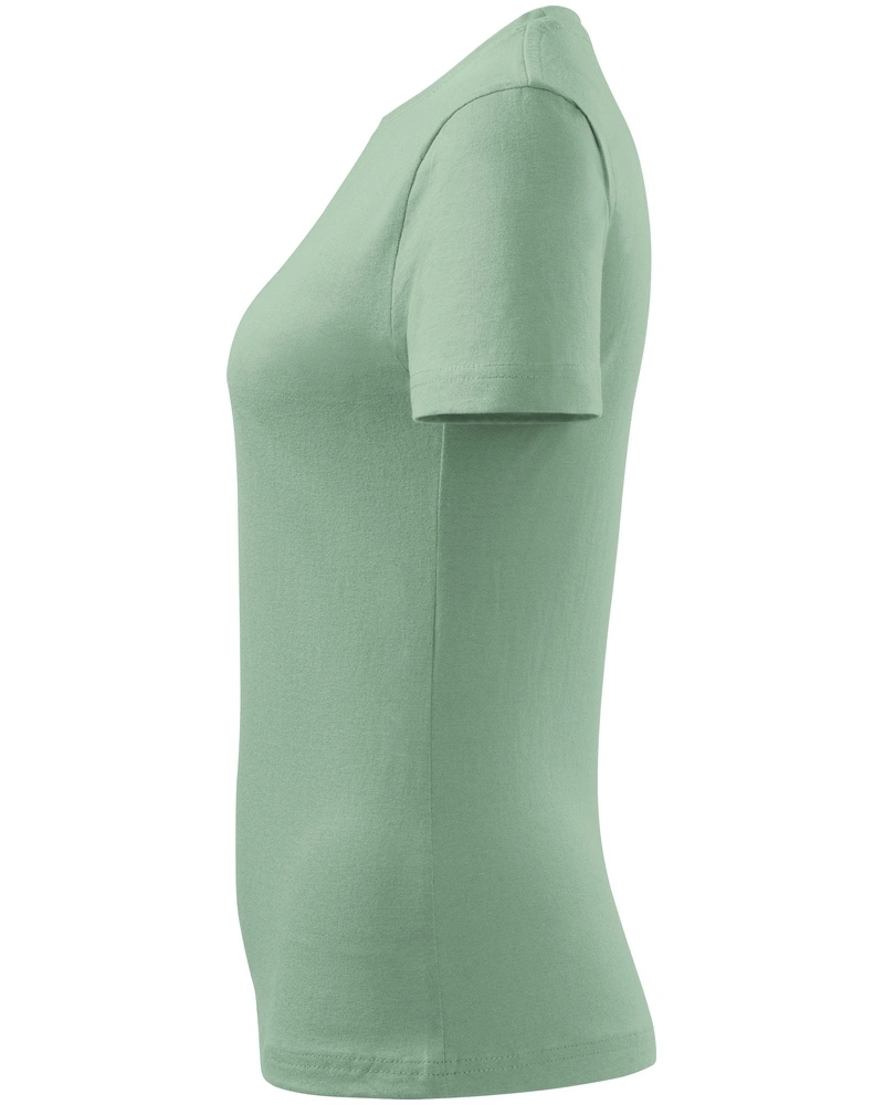 Klasické dámské tričko s lehce vypasovaného střihu. Úzký lem průkrčníku z žebrového úpletu 1:1 s 5 % elastanu, vnitřní část průkrčníku začištěna páskou z vrchového materiálu, zpevnění ramenních švů páskou.