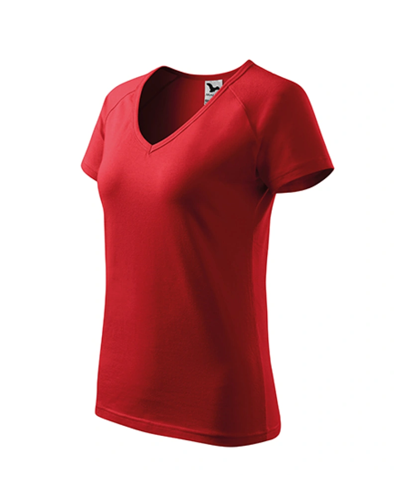 Dámské tričko s krátkým raglánovým rukávem přiléhavého střihu s bočními švy, výstřih ve tvaru V, průkrčník lemován vrchovým materiálem.