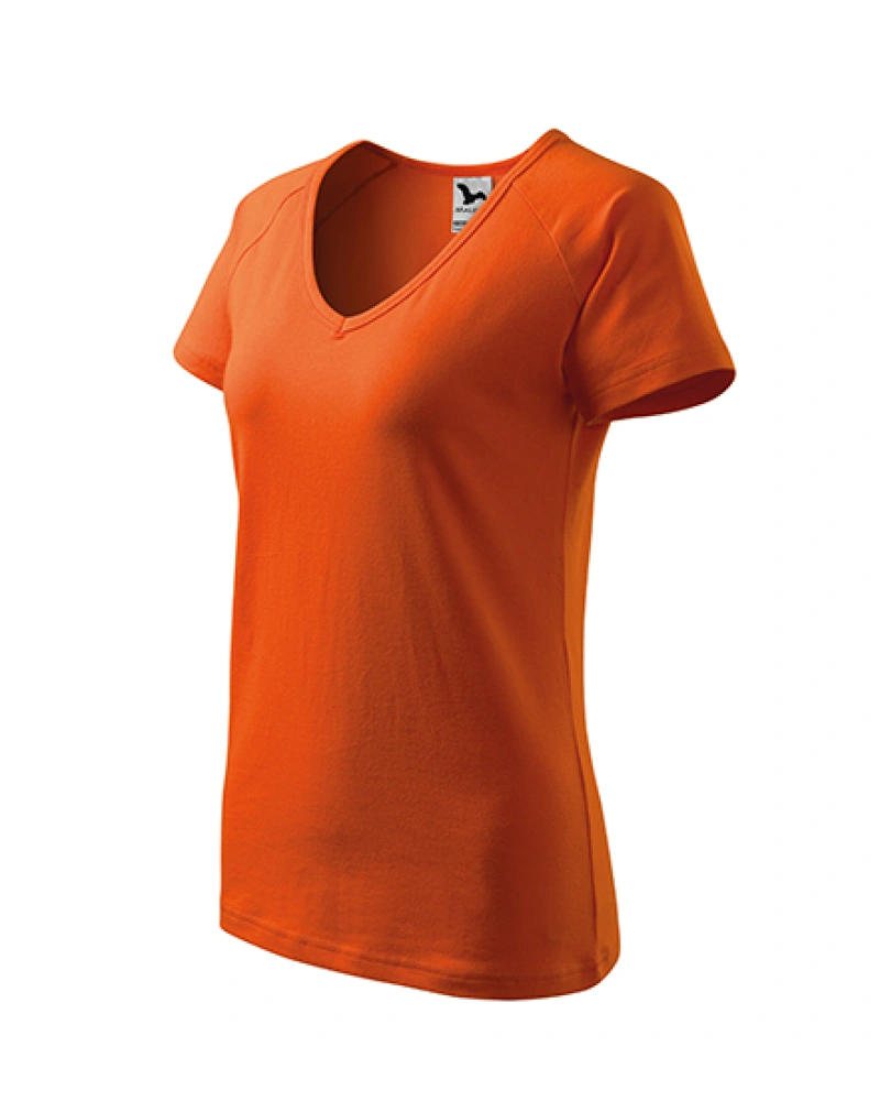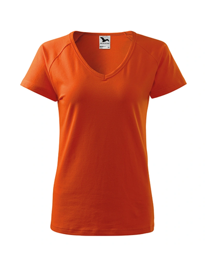 Dámské tričko s krátkým raglánovým rukávem přiléhavého střihu s bočními švy, výstřih ve tvaru V, průkrčník lemován vrchovým materiálem.