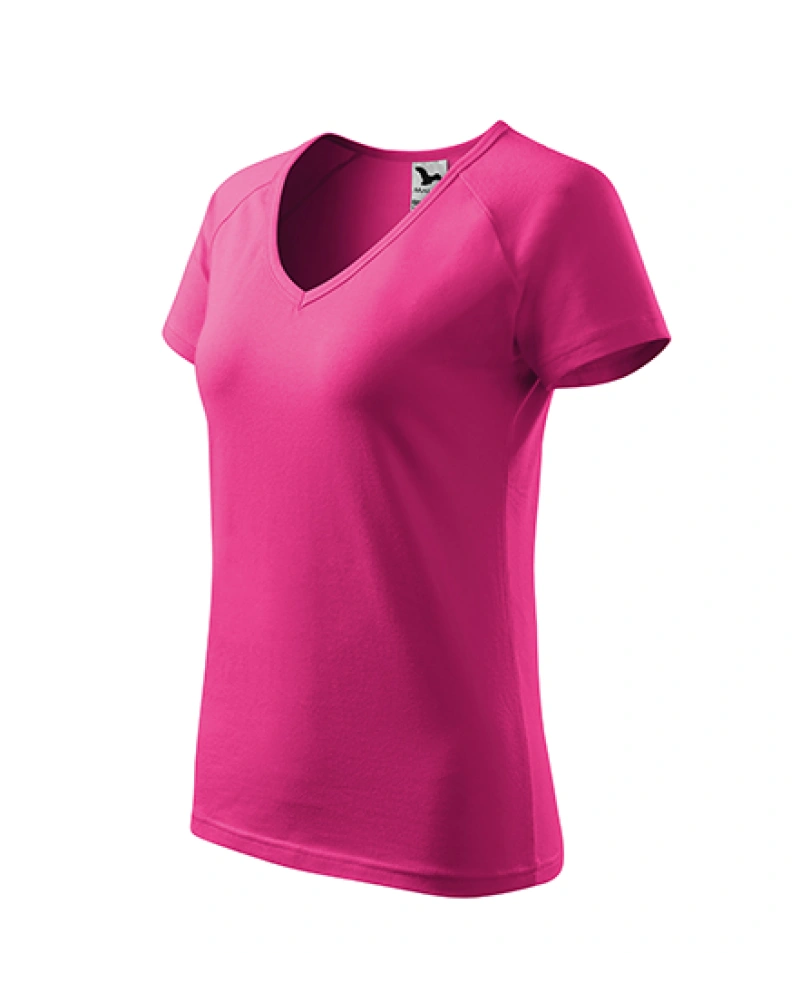 Dámské tričko s krátkým raglánovým rukávem přiléhavého střihu s bočními švy, výstřih ve tvaru V, průkrčník lemován vrchovým materiálem.