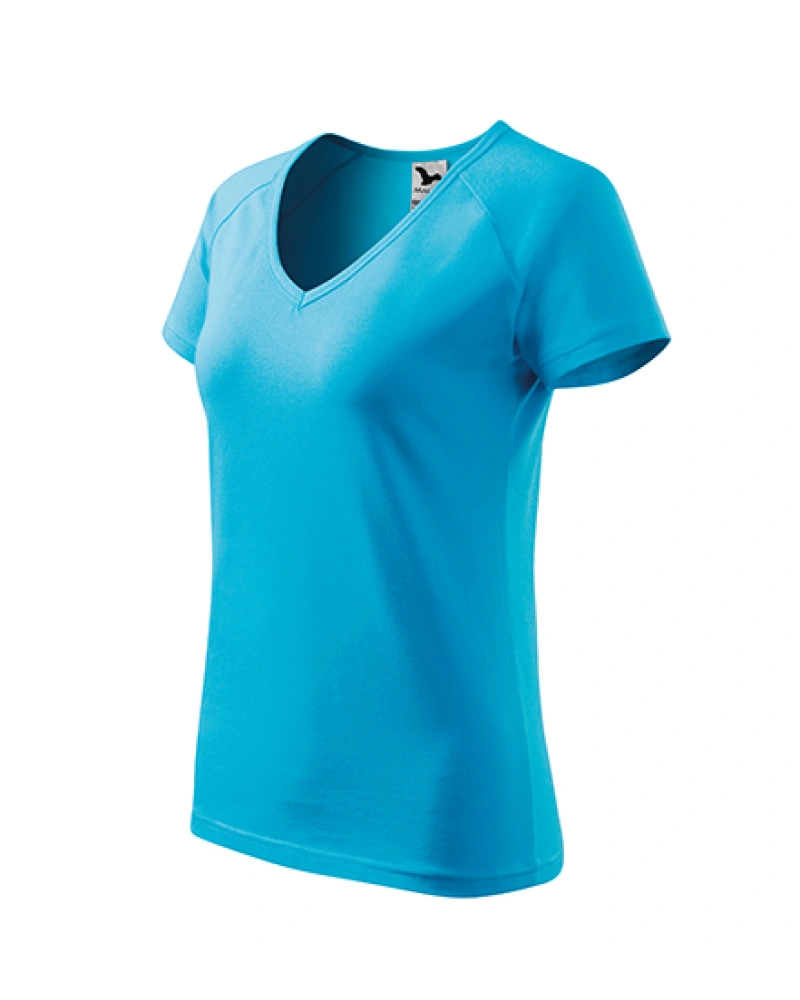 Dámské tričko s krátkým raglánovým rukávem přiléhavého střihu s bočními švy, výstřih ve tvaru V, průkrčník lemován vrchovým materiálem.