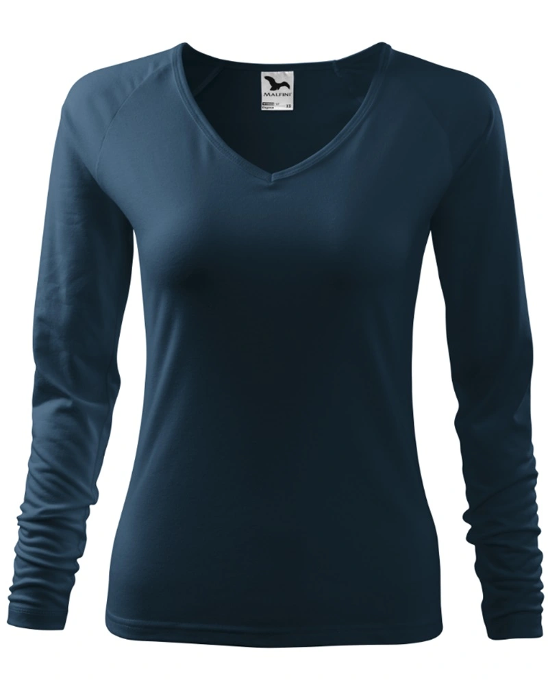 Dámské tričko ELEGANCE přiléhavého střihu s bočními švy, výstřih ve tvaru V, průkrčník lemován vrchovým materiálem, dlouhé raglánové rukávy.