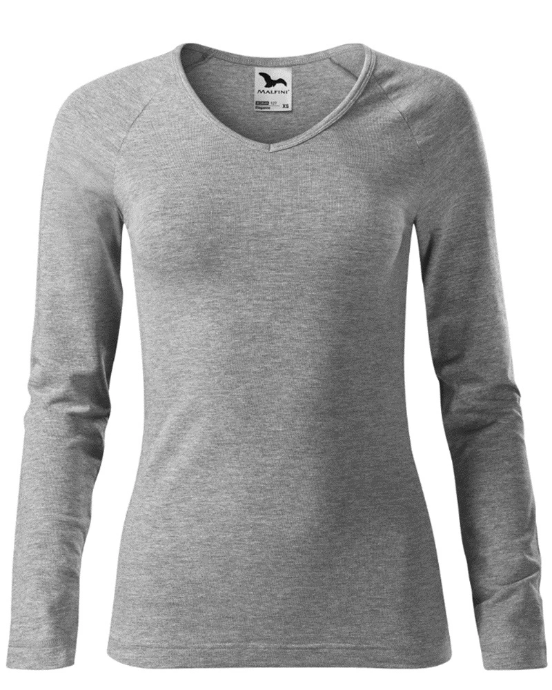 Dámské tričko ELEGANCE přiléhavého střihu s bočními švy, výstřih ve tvaru V, průkrčník lemován vrchovým materiálem, dlouhé raglánové rukávy.