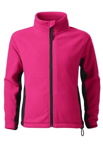 Dětská fleecová mikina s celopropínacím spirálovým zipem s krytkou brady, vnitřní průkrčník začištěn kontrastní páskou, kapsy se spirálovým zipem, dolní lem na stažení elastickou šňůrkou, dekorativní prošití.