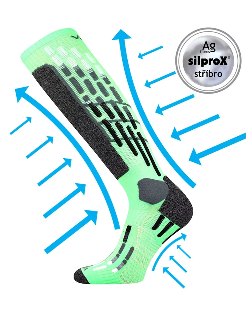 Kompresní podkolenky VoXX® VXPRES mají speciální konstrukci pro Vaše zdraví. Pozitivně působí na krevní oběh díky stupňovitému masážnímu tlaku. Vhodné jsou zejména tam, kde dochází k přílišnému zatížení dolních končetin. Jsou vhodné pro sportovní aktivity, kdy se svaly rychleji regenerují, průtok krve je zvýšený a tím se svaly lépe okysličují. Kompresní podkolenky VoXX® jsou vhodné také pro dlouhodobé stání nebo naopak dlouhé sezení v zaměstnání, dlouhodobé cestování v různých dopravních prostředcích. Kvalitní podkolenky v pestrých neónových barvách působí i jako prevence proti křečovým žilám, jsou vhodné pro budoucí maminky. Další výhodou je antibakteriální ochrana ionty stříbra v materiálu silproX®, chrání před vznikem bakterií a tím i zápachem. Prodyšné zóny zajišťují dobrý odvod potu od pokožky a zóna na nártu zabraňuje přetáčení podkolenek v obuvi. Kompresní podkolenky jsou v teplotní třídě B, vhodné do rozmezí teplot od -5°C do +20°C. KOMPRESNÍ TŘÍDA 1.