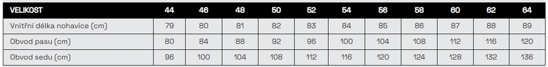 Velmi pevný odolný materiál, v oblasti sedu a rozkroku velmi pružný zajišťující volnost při pohybových aktivitách