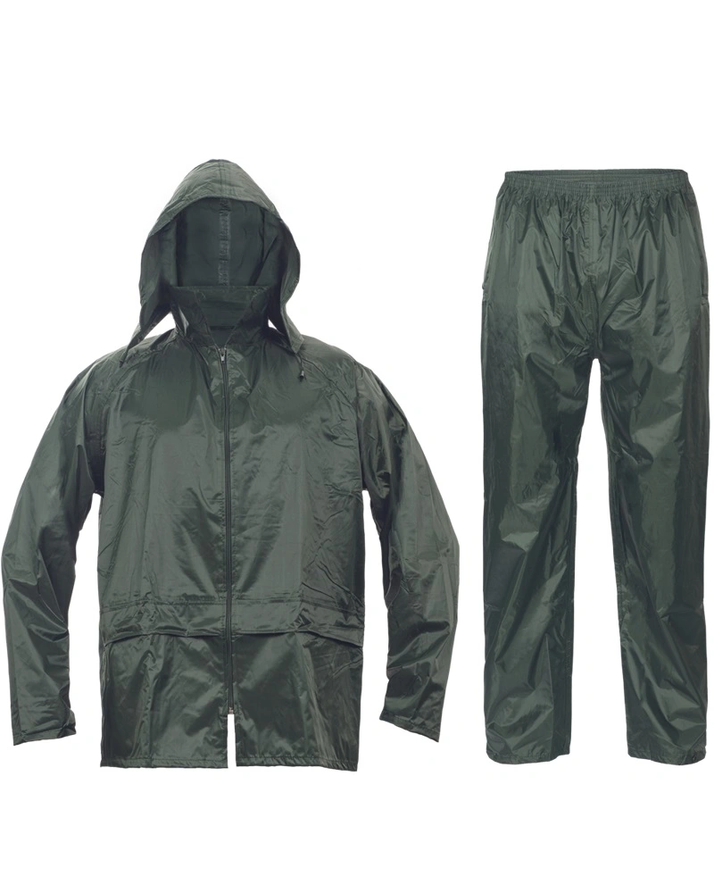 Voděodolný dvoudílný oblek - 3/4 plášť s kapucí a kalhoty v pase na gumu. Všechny spojovací švy jsou zatavené, materiál s nánosem PVC, dvě přední kapsy kryté légami proti průniku vody, spodní část rukávů lze regulovat drukem, ventilace na zádech a v podpaží.