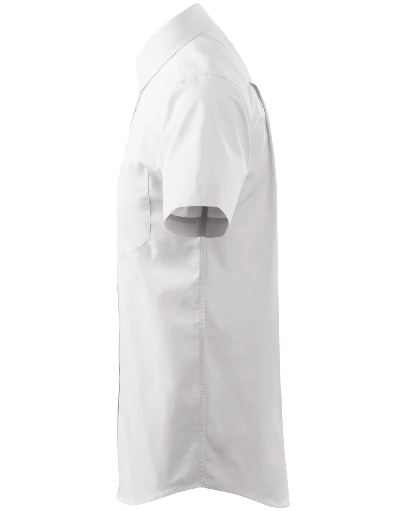 Dámská košile s krátkým rukávem. Pasové a prsní záševky, tvarovaný dolní okraj, dvojité sedlo na zadním dílu, projmutý střih s bočními švy, dvoudílný košilový límec, přední kraje začištěny légou, perleťové knoflíčky v barvě materiálu (1 náhradní navíc).