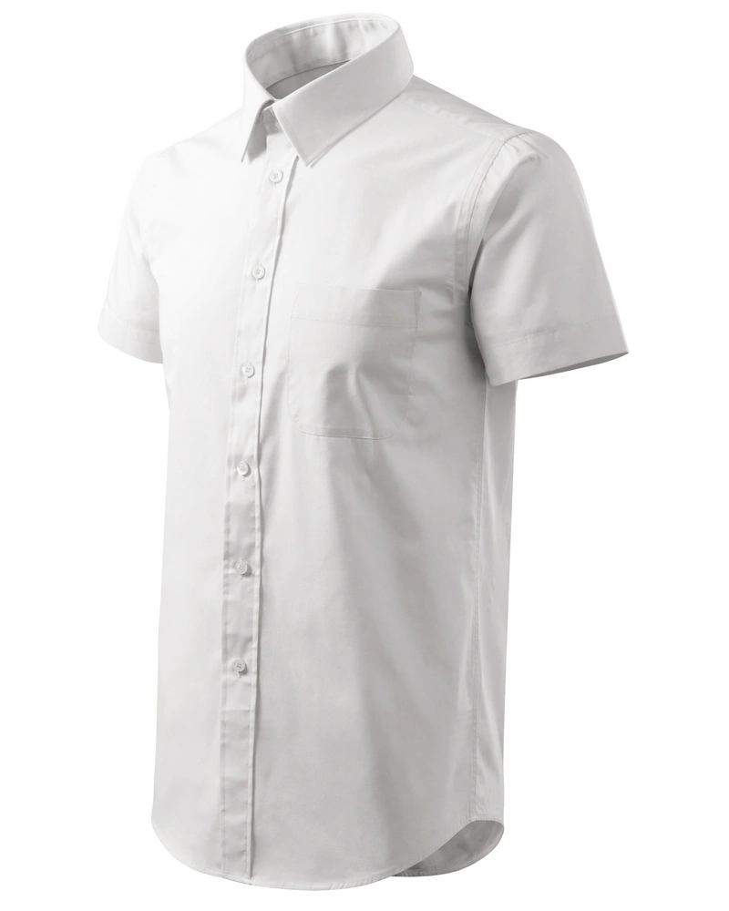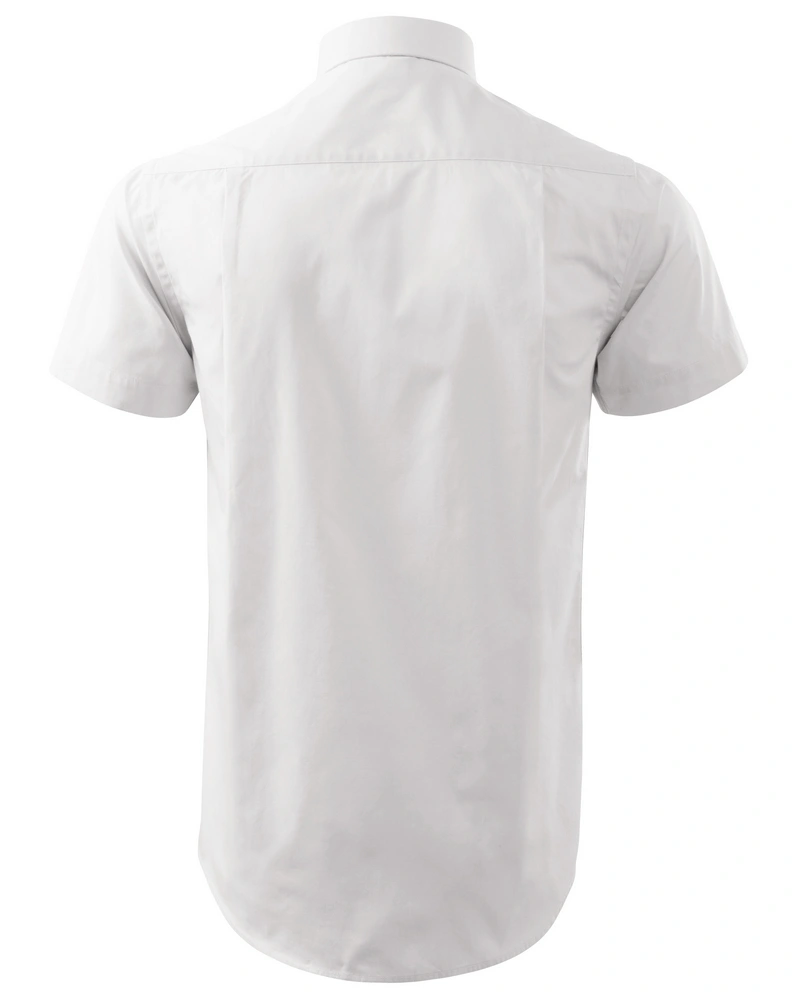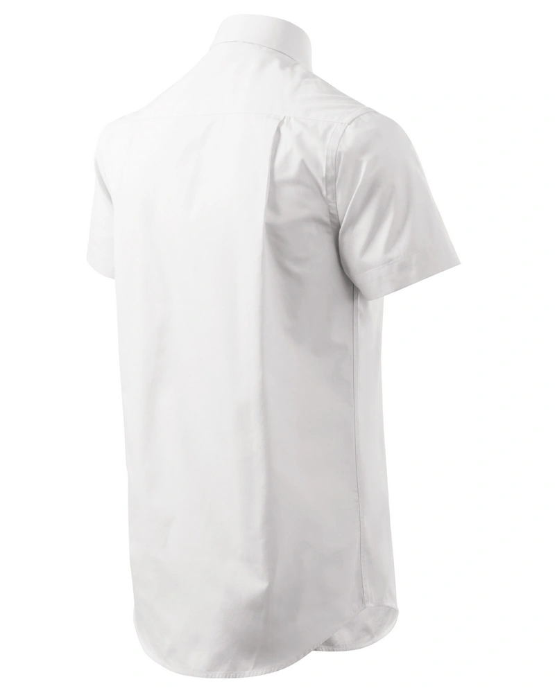 Pánská košile klasického střihu s bočními švy, dvojité sedlo a záhyby na zadním dílu, dvoudílný košilový límec, přední kraje začištěny légou, nakládaná náprsní kapsa, knoflíčky v barvě materiálu.