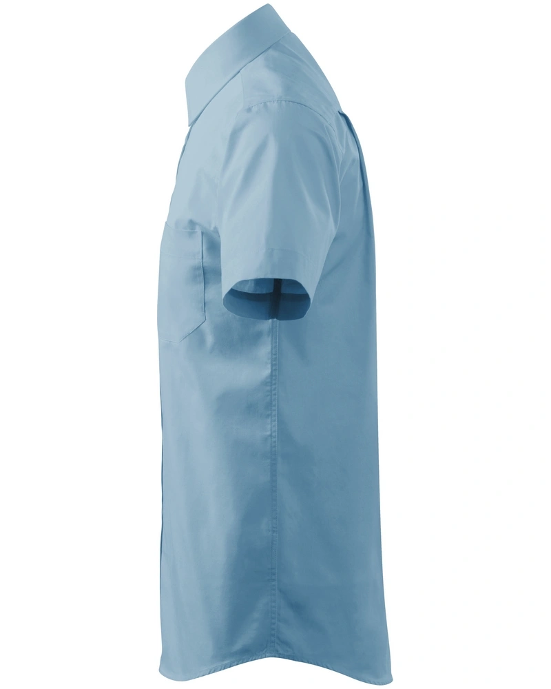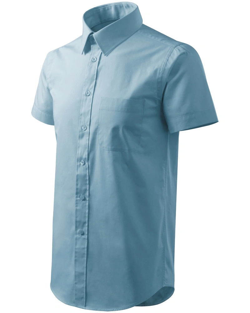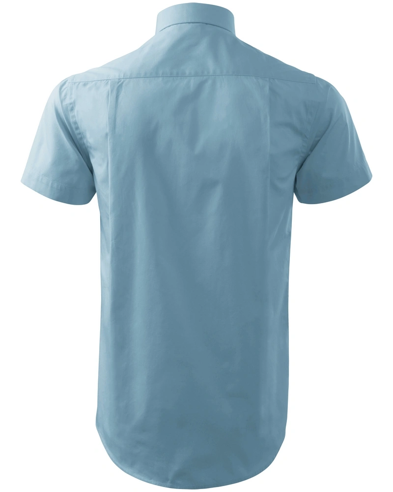 Pánská košile klasického střihu s bočními švy, dvojité sedlo a záhyby na zadním dílu, dvoudílný košilový límec, přední kraje začištěny légou, nakládaná náprsní kapsa, knoflíčky v barvě materiálu.