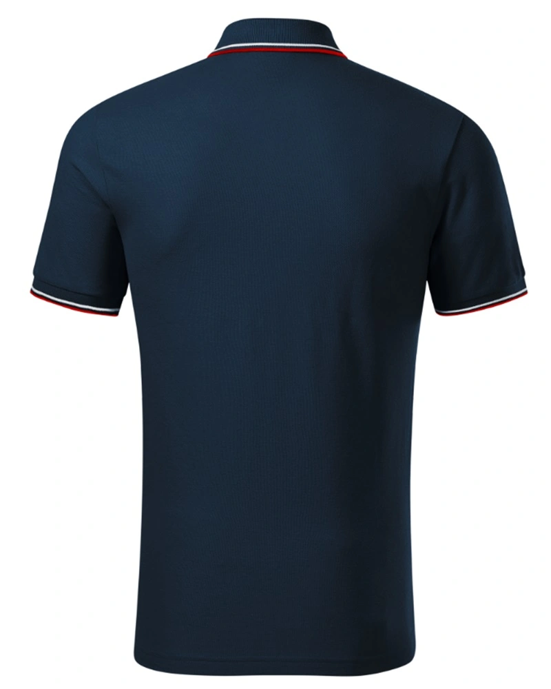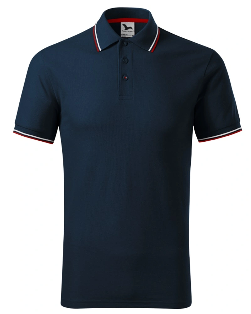 Pánská polokošile s dvojitým kontrastním proužkem na límci a manžetě. Límec a manžety na rukávech z žebrového úpletu 1:1. Střih s bočními švy, zpevněný ramenní šev, léga s 3 knoflíčky v barvě materiálu, vnitřní průkrčník začištěn páskou z vrchového materiálu.