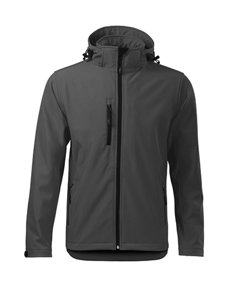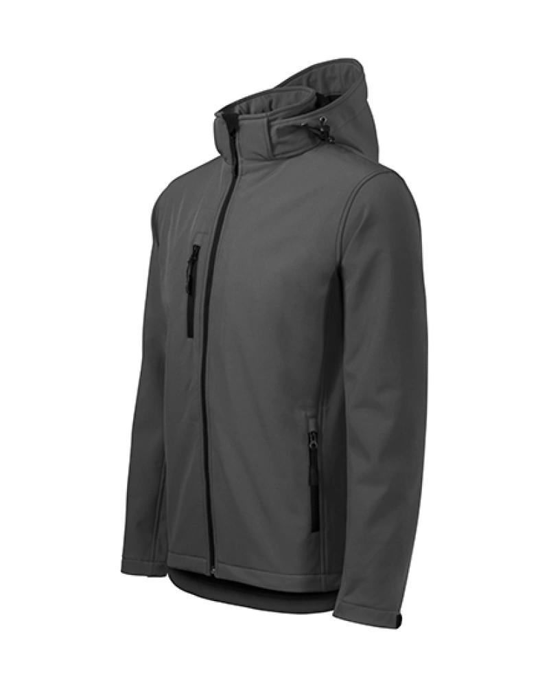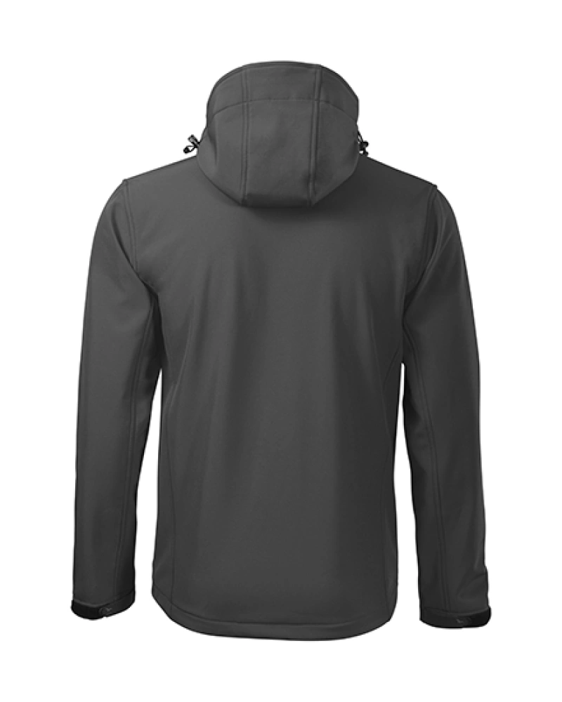 Pánská softshellová bunda s odnímatelnou kapucí. Celopropínací reverzní spirálový zip s krytkou brady, lemy rukávů nastavitelné suchým zipem, dolní lem na stažení elastickou šňůrkou, kapsy s reverzním spirálovým zipem, náprsní kapsa, vnitřní náprsní kapsa na zip se vstupem pro branding, tvarovaný a mírně prodloužený zadní díl.