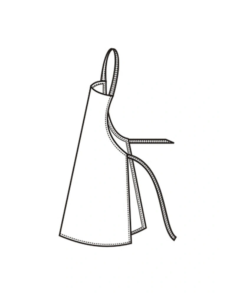 Zástěra v pase na zavazování. Dvě boční kapsy s lemovanými vstupy. Náprsenka se šlemi na zavazování. Délka pod kolena.