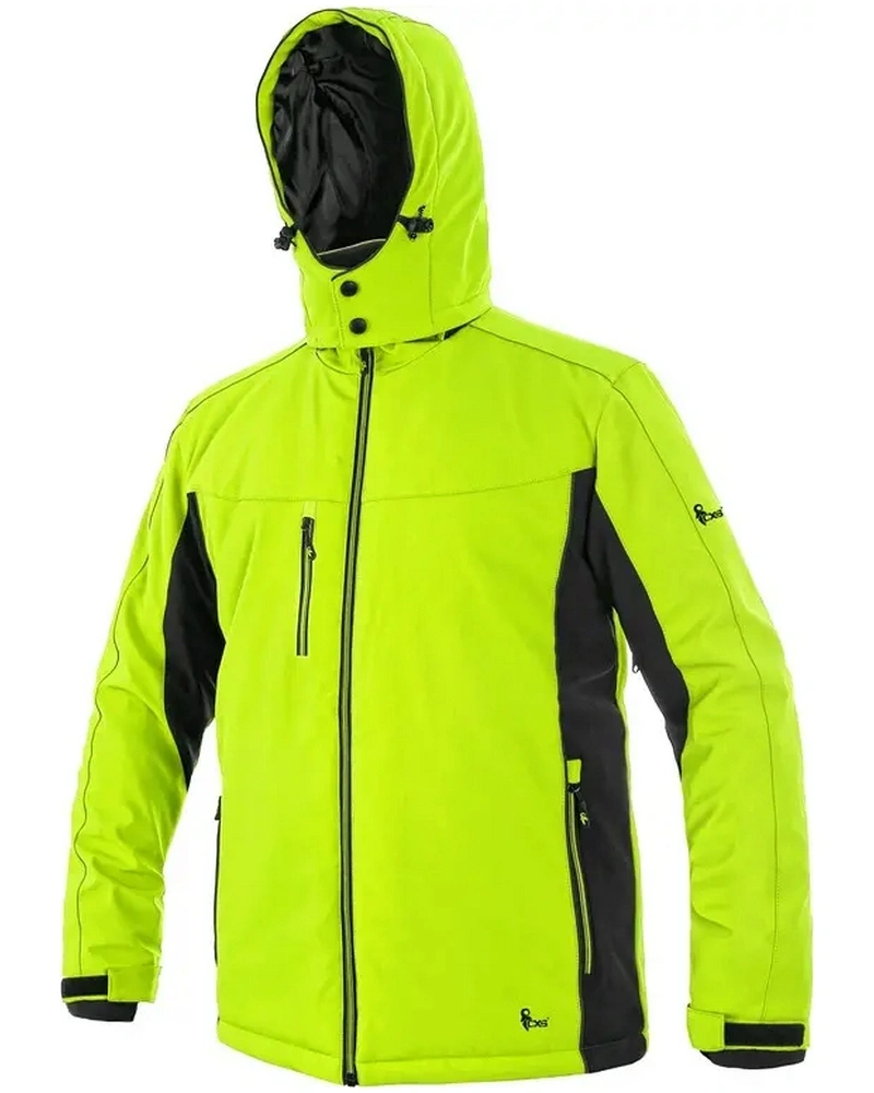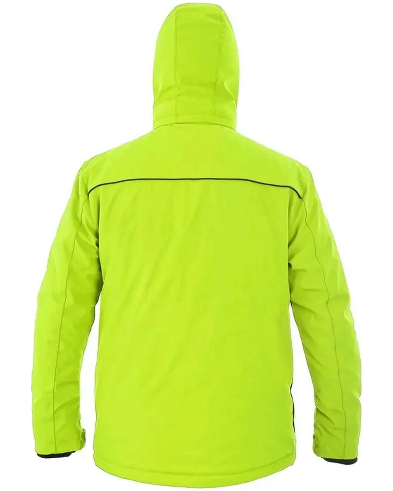 Pánská zateplená softshellová bunda, odolná proti vodě a větru, větrání v podpaží, odepínací kapuce, regulovatelná manžeta na rukávech a pružná manžeta v rukávech, stahování v dolním okraji, černé reflexní výpustky, TPU membrána, odolnost materiálu proti průniku vody 10 000 mm mimo oblast švů, paropropustnost 3 000 g/m2/24 h, podšívka je kombinací materiálů s fleecem, na levém spodním rukávu kapsička na zip, 2 spodní kapsy na zip, vnitřní kapsa.