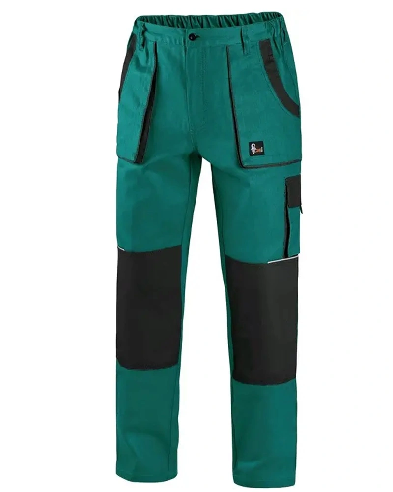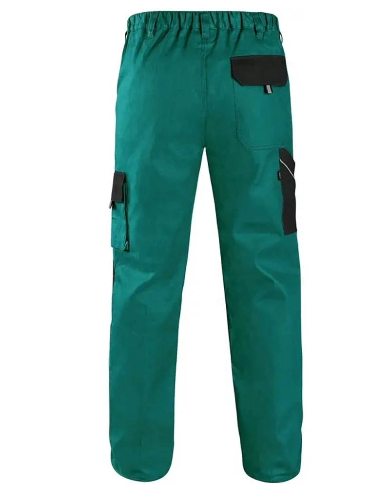 Pánské montérkové kalhoty, pas s poutky na opasek, vzadu do gumy, přední kapsy, boční kapsa na svinovací / skládací metr, boční kapsa na mobil / peněženku, zdvojená kolena, zadní kapsa s klopou, reflexní doplňky.