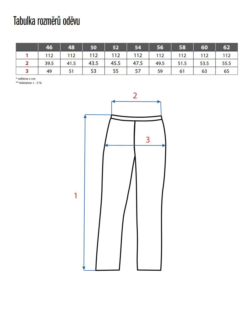 Dámské montérkové kalhoty, pas s poutky na opasek, pas na bocích do gumy (od velikosti 50), přední vakové kapsy, boční multifunkční kapsa, zadní dvojité kapsy, reflexní doplňky.