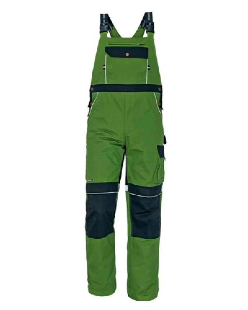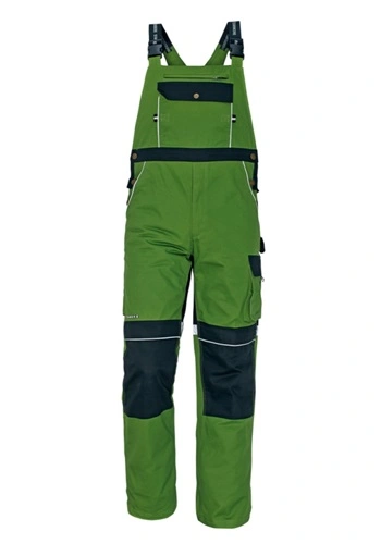 Pracovní kalhoty s laclem vysoké odolnosti, elastický pas, kovové zipy a druky zapínání, 6 funkčních kapes, zesílená kolena s kapsami na vkládání nákoleníků.