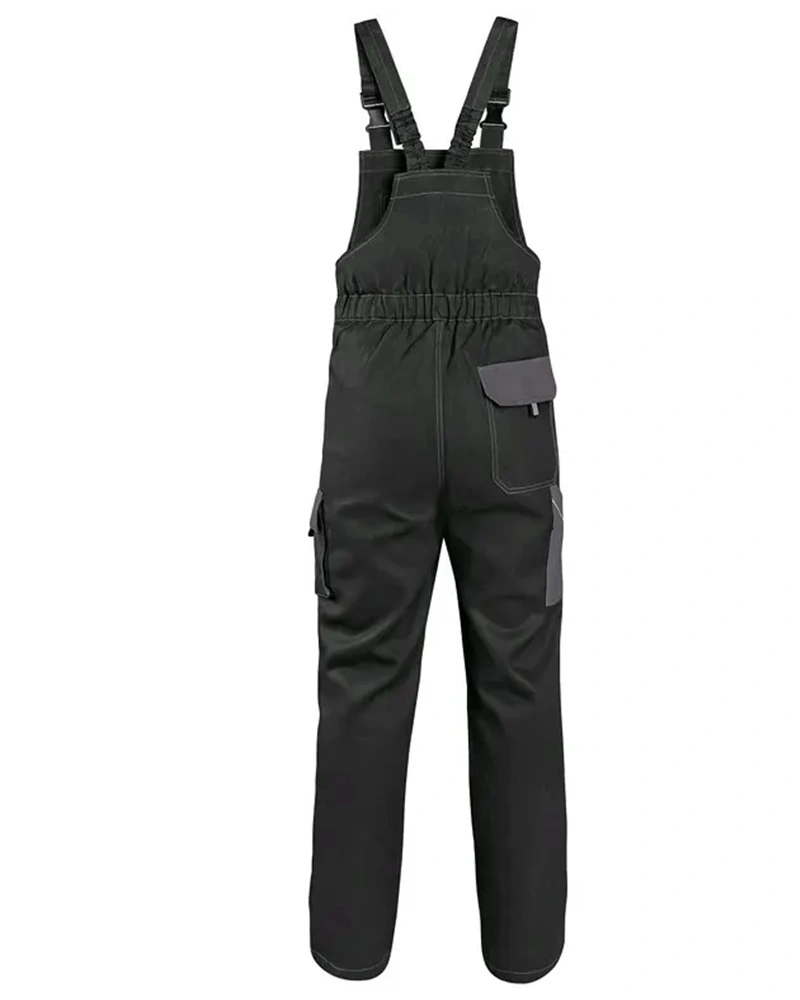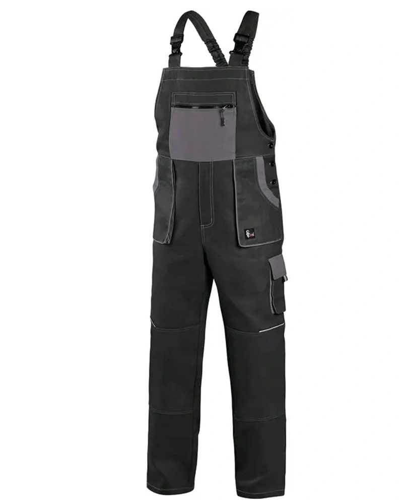 Pánské montérkové kalhoty s náprsenkou, náprsní kapsa na zip, pas vzadu do gumy, přední kapsy, boční kapsa na svinovací / skládací metr, boční kapsa na mobil / peněženku, zdvojená kolena, zadní kapsa s klopou, šle s gumou vzadu, reflexní doplňky.
