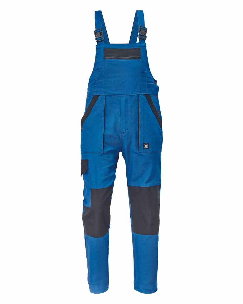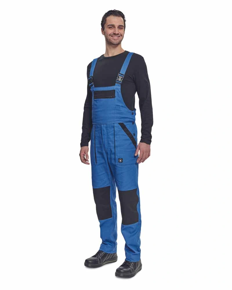Pánské montérkové kalhoty s náprsenkou, náprsní kapsa s klopou, pas s poutky na opasek, v zadní části guma s knoflíkem pro přizpůsobení velikosti, přední klínové kapsy, multifunkční kapsy na obou stranách, kolena zesílena materiálem 600D polyester s možností vložení kolenních výztuh, dvě zadní kapsy s klopami, spodní část nohavic vyztužena materiálem 600D polyester, šle s gumou vzadu, reflexní doplňky.