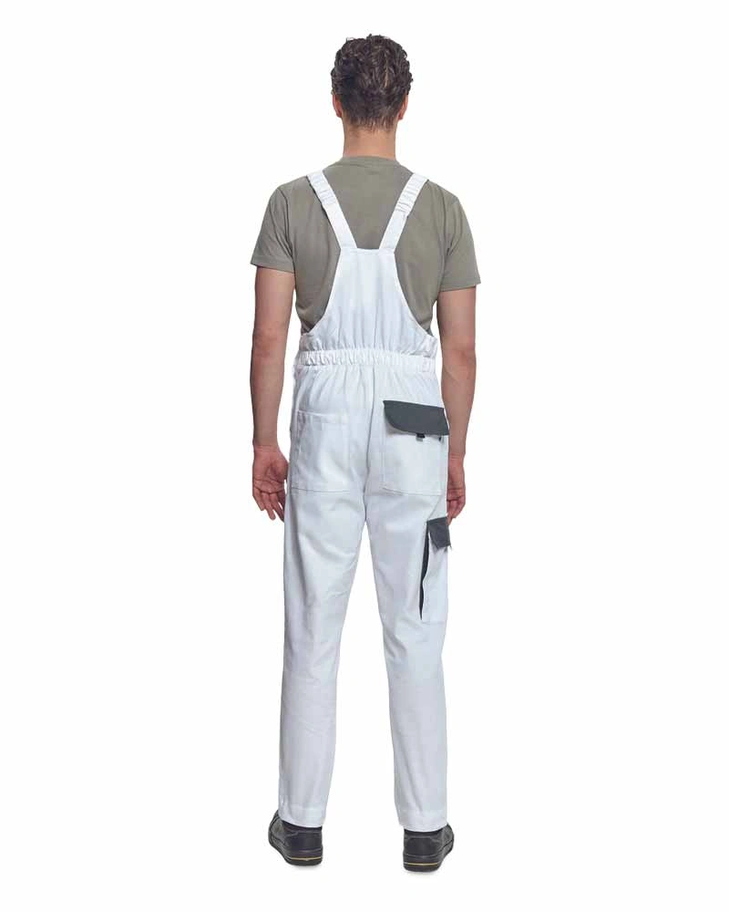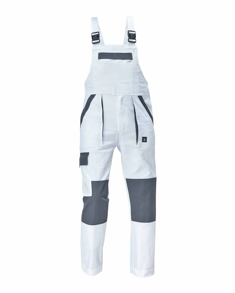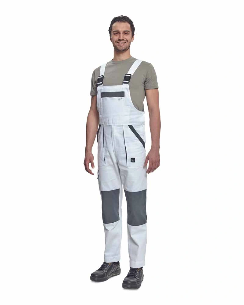 Pracovní kalhoty s laclem vysoké odolnosti, elastický pas, kovové zipy a druky zapínání, 6 funkčních kapes, zesílená kolena s kapsami na vkládání nákoleníků.