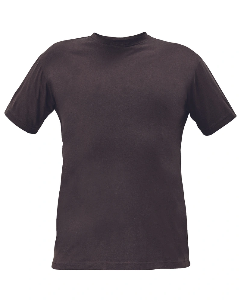 Klasické dámské tričko s lehce vypasovaného střihu. Úzký lem průkrčníku z žebrového úpletu 1:1 s 5 % elastanu, vnitřní část průkrčníku začištěna páskou z vrchového materiálu, zpevnění ramenních švů páskou.