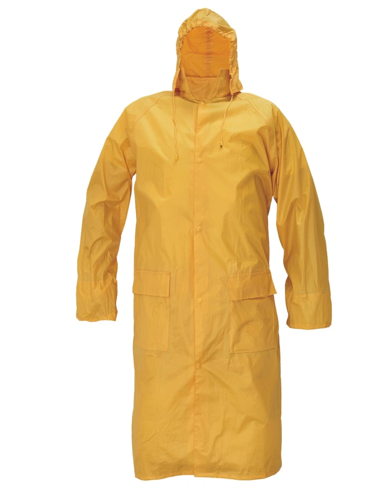 Voděodolný 3/4 plášť s kapucí, prodloužená délka, všechny spojovací švy jsou zatavené, materiál s nánosem PVC, dvě přední kapsy kryté légami proti průniku vody, vnitřní manžeta na gumu, ventilace na zádech a v podpaží.