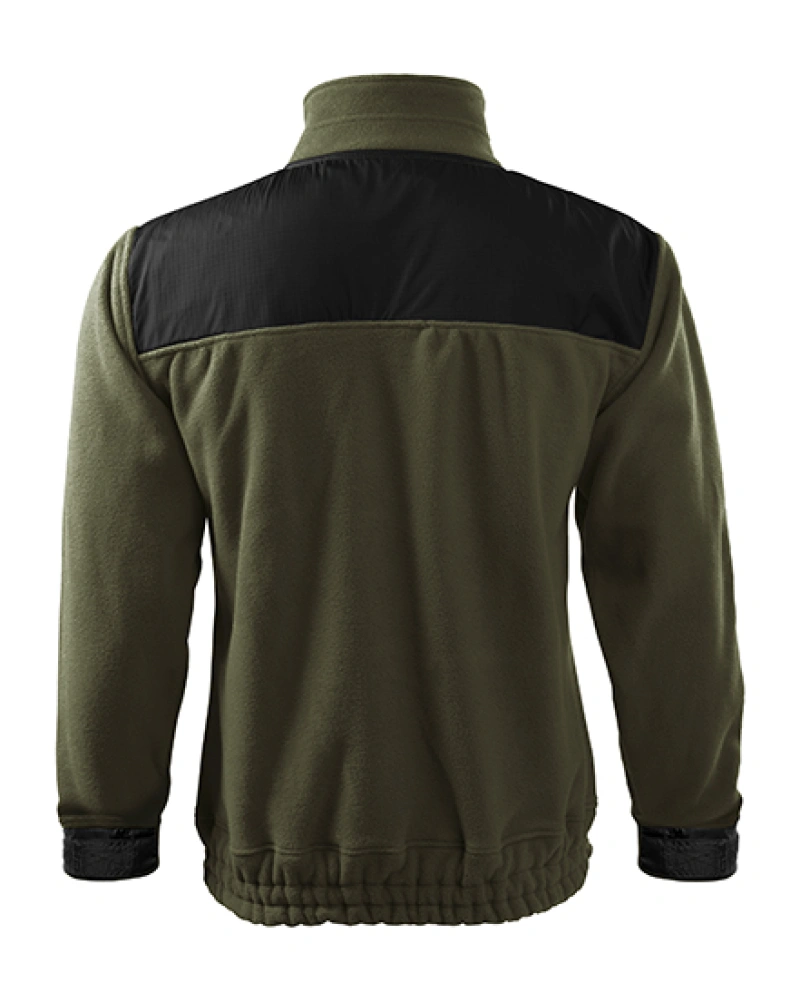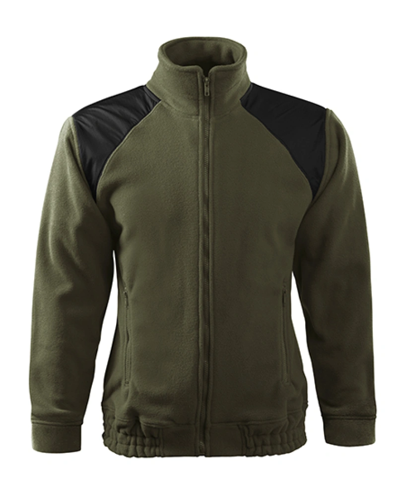 Unisexová fleecová mikina s celopropínacím kostěným zipem, ramena kryta nepromokavou, oděruvzdornou tkaninou, vnitřní průkrčník začištěn páskou v barvě vrchového materiálu, dolní lem stažený pruženkou, lemy rukávů nastavitelné suchým zipem.