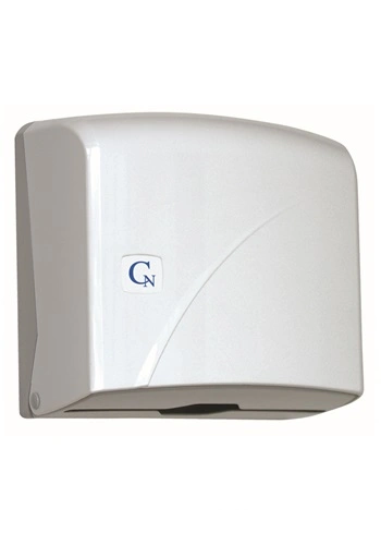 Nástěnný zásobník na papírové ručníky v roli o rozměru : pr. 20x20cm odvíjené středem přes průvlak. Ten zabezpečuje dělení ručníku na jednotlivé útržky, pro správnou funkci musí mít role vhodnou gramáž i perforaci. Je vhodný do provozů s větší spotřebou papírových utěrek, kde pro snížení spotřeby je třeba zajistit jejich dělení na jednotlivé útržky. Vyroben je z bílého ABS plastu se světle šedou základnou. Lze montovat pouze na vruty
